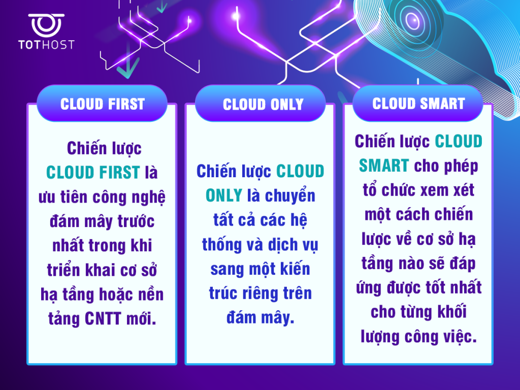 Điện toán đám mây cho phép bạn làm việc ở bất cứ đâu. Sau đại dịch covid gần đây, các chiến lược đám mây đã và đang tạo ra không gian làm việc mới. Ở đó, các nhân viên có thể truy cập dữ liệu, công cụ và kho lưu trữ ở bất cứ nơi đâu trên khắp thế giới. Trong đó, cloud only, cloud first là những chiến lược điển hình.